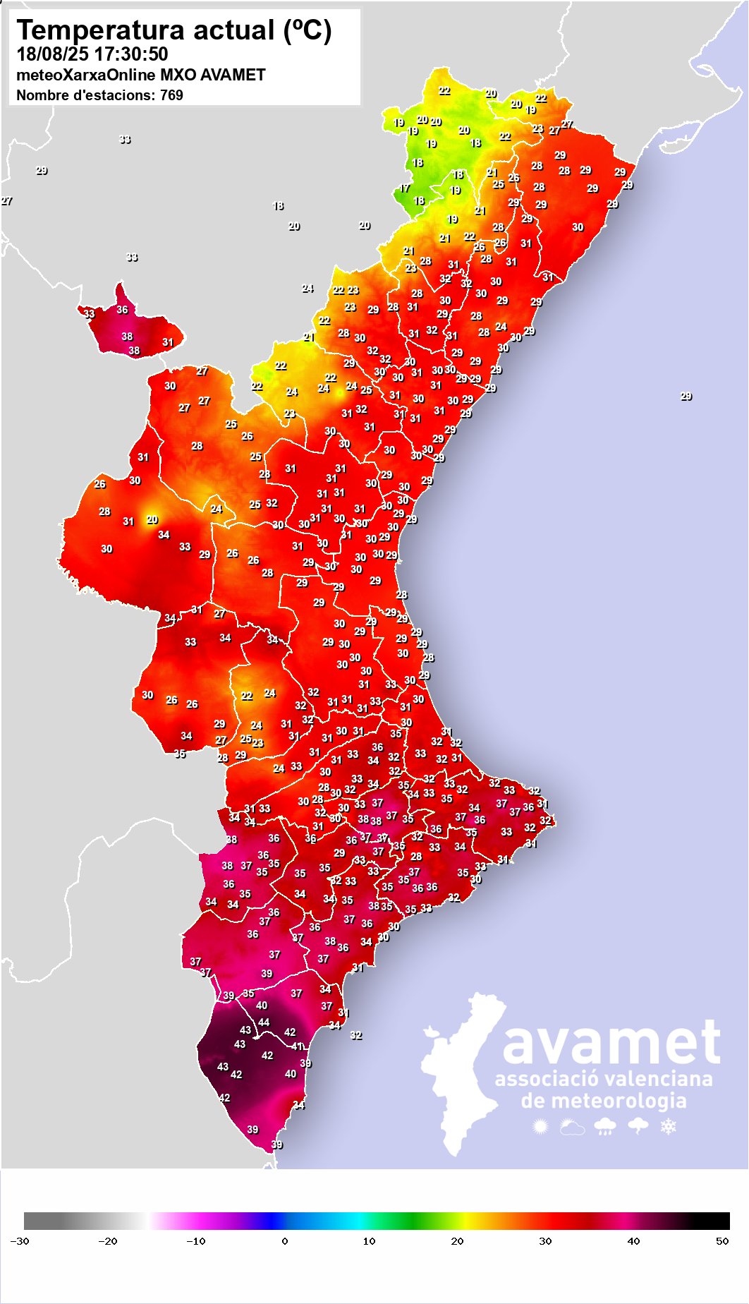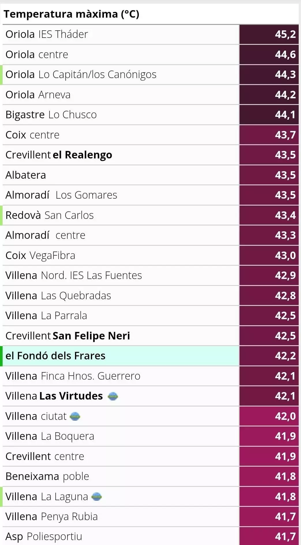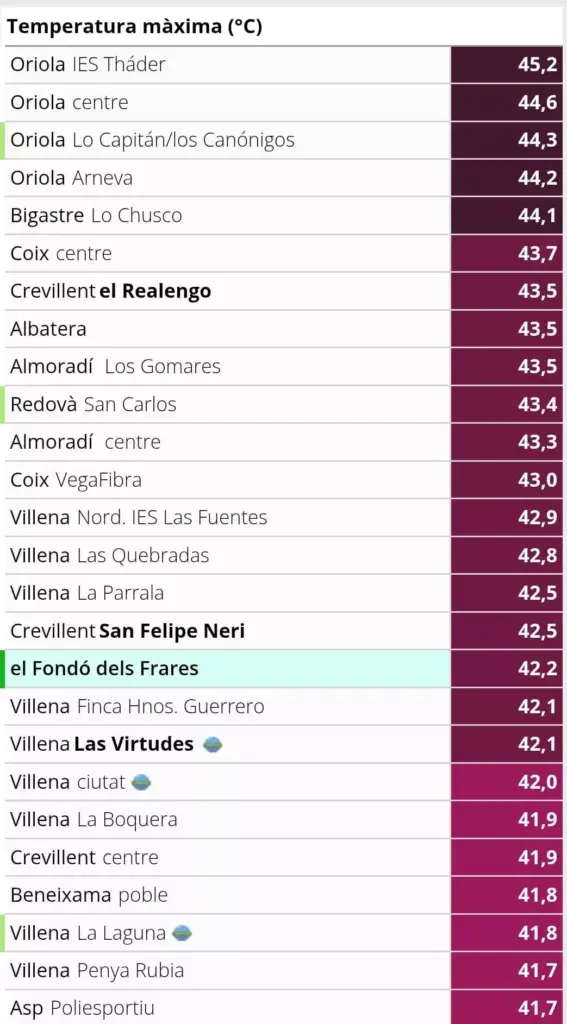 Według sieci Avamet inne maksymalne temperatury obejmowały Crevillent wynoszący 43.5°C, Bigastro 44.1°C, Cox 43.7°C, Villena i Almoradí 42.9°C, Albatera i Redován 42.8°C, Hondón de las Nieves 42.2°C, Aspe 41.7°C i Beneixama 41.6°C. Sieć Aemet podała również, że temperatura w Elche wynosiła 42°C, Pinoso 41.7°C, Novelda 41.4°C, Alcoy 40.7°C, Alicante 39°C i Xàbia 39°C.