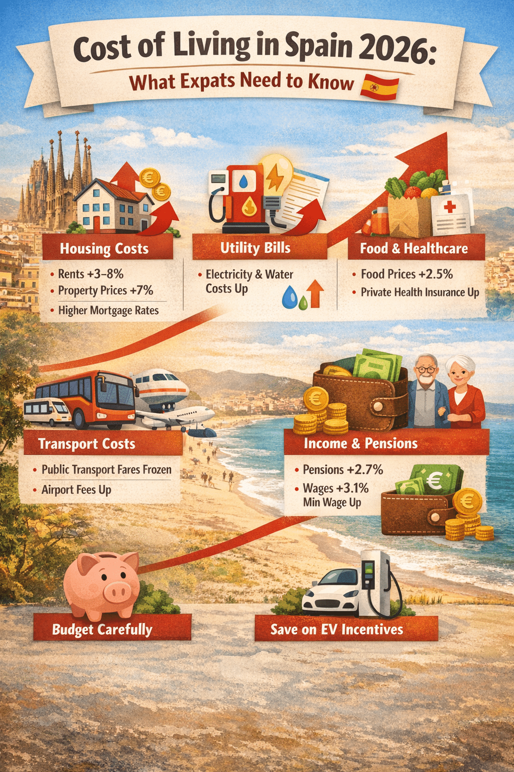 Ogólnie rzecz biorąc, rok 2026 przyniesie wzrost kosztów w większości dziedzin życia w Hiszpanii, od mieszkań i mediów po żywność i opiekę zdrowotną. Dla ekspatów ostrożne planowanie budżetu będzie kluczowe, zwłaszcza dla najemców, właścicieli domów i osób korzystających z prywatnego ubezpieczenia zdrowotnego.