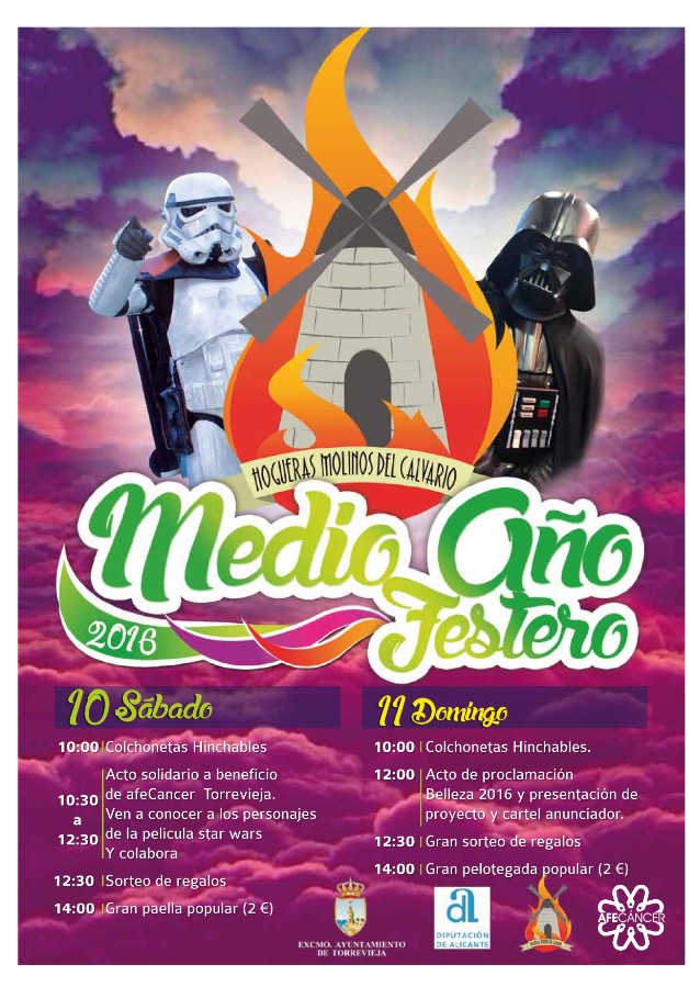 La Hoguera del Barrio Molinos del Calvario celebrará a lo largo de las mañanas del próximo fin de semana el Medio Año Festero, comenzando a partir de las 10 de la mañana, en la calle Azorín en el tramo comprendido entre las calles La Paz y San Pascual, que este año incluirá un acto solidario a beneficio de Afecáncer, donde además también se realizarán divesas actividades para recaudar fondos para las hogueras, Adulta e infantil, que se plantarán en junio que este año cumplen su 25 aniversario, para lo cual han preparado una paella y una pelotegada además de los tradycyjne sorteo de regalos, incluyendo también actividades gratuitas centradas especialmente en asegurar la Diversión niños y Mayores, en esta jornada festiva. Otros de los actos destacados serán la proklamacja de la Belleza 2017 y la presentación de los Carteles y proyectos.